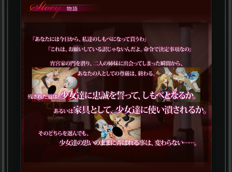 <a href="http://m-o.product.co.jp/game/shoujomeikyu/top.html"><img src="http://m-o.product.co.jp/game/shoujomeikyu/images/banner4.jpg" width="650" height="120" alt="少女迷宮〜淫猥姉妹の男性調教支配録〜"></a>
